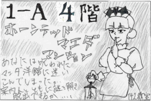 私達1-Aは洋館風のお化け屋敷『ホーンテッド・マエダマンション』をやります。案内人と共に館に眠る謎を追う体験型アトラクションです。ぜひ、お越しください。 142教室 4階